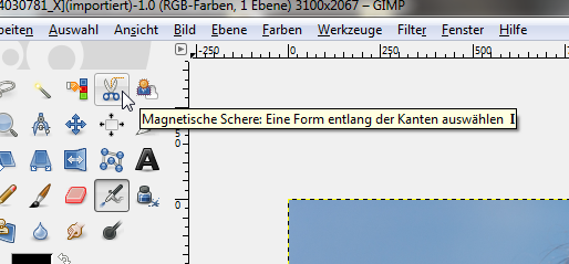 In Gimp finden Sie zahlreiche Werkzeuge, mit denen Sie Ihre Fotos bearbeiten können. Hilfreich für schnelles Freistellen ist hier besonders die magnetische Schere, die an dem Scheren Icon erkennbar ist.