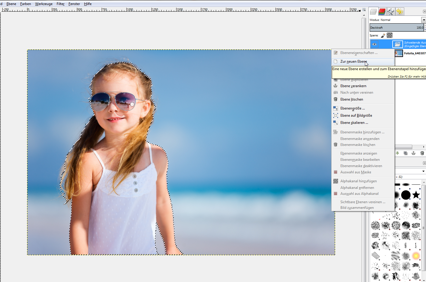 Nun können Sie mit STRG+C und STRG+V eine neue Ebene erstellen. Diese klicken Sie mit rechts an und wählen „zur neuen Ebene“. Nun haben Sie Ihr Objekt auf einem transparenten Hintergrund.