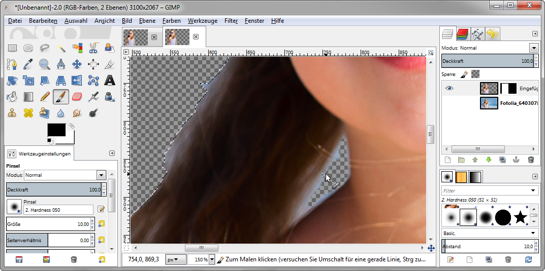 Außerdem können Sie die Auswahl mit einer Maske und einem Pinsel verfeinern. Legen Sie eine Maske auf die Ebene mit dem Objekt und bearbeiten Sie diese mit dem Pinselwerkzeug, um Unsauberheiten auszubessern.