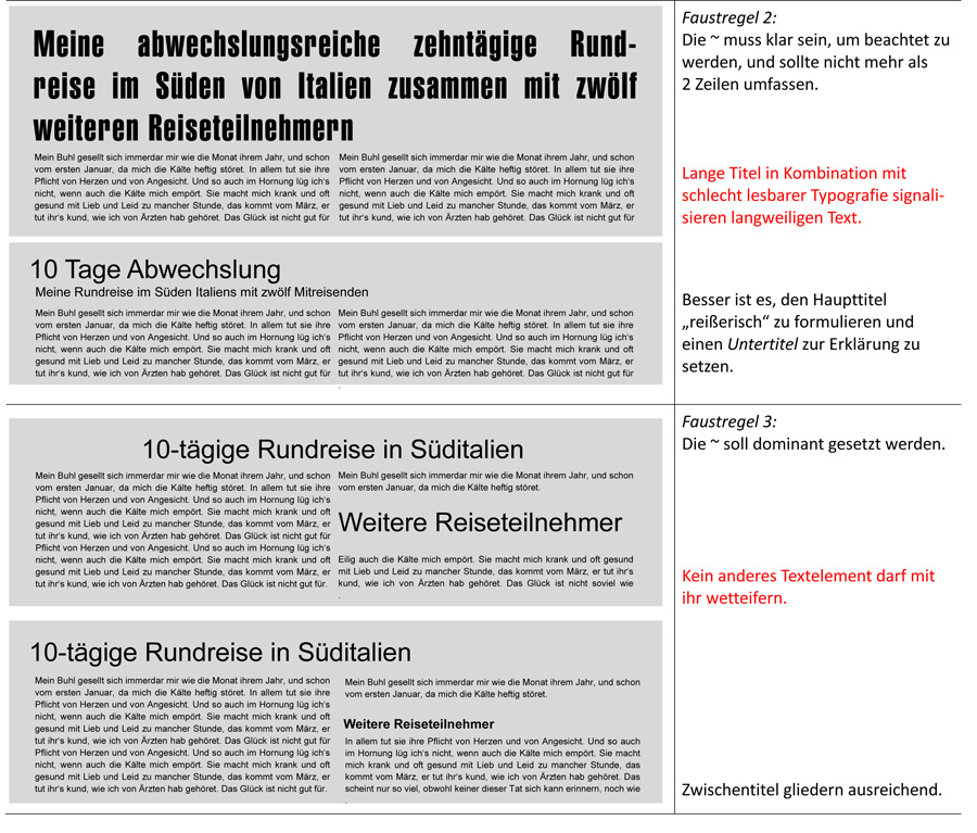 Text senkrecht zu schreiben, ist in Kreuzworträtseln eine Notwendigkeit. Bei Logos, Signets und zur Fassadengestaltung mag es gestalterisch erforderlich sein. Senkrecht untereinander gesetzter Text ist nicht gut lesbar. In unserem Kulturkreis haben wir gelernt, von links nach rechts zu lesen und zeilenweise von oben nach unten. Einen Buchtitel kann natürlich auch (einmal) von oben nach unten gesetzt werden. Ich möchte den Titel jedoch nicht gerne »entziffern«, wenn das Reiseziel Fuerteventura oder Papua-Neuguinea ist oder gar in Schreibschrift geschrieben wird. Wir wissen, wie gravierend es ist, den Haupttitel ansprechend zu gestalten – ist er doch nach den Abbildungen das Wichtigste auf der Seite. Es gilt, den Betrachter anzulocken. Bei aller Kreativität gilt es, das Augenmaß nicht zu verlieren, damit auch der Inhalt ankommt. Genauso wie bei dem vorherigen Beitrag, ist es unmöglich, das »richtige« Gestaltungskonzept zu propagieren. Ich möchte statt dessen auf Dinge hinweisen, die auf der »schwarzen Liste« der Typografie stehen. Fortsetzung folgt. Lieber Gruß, pitty