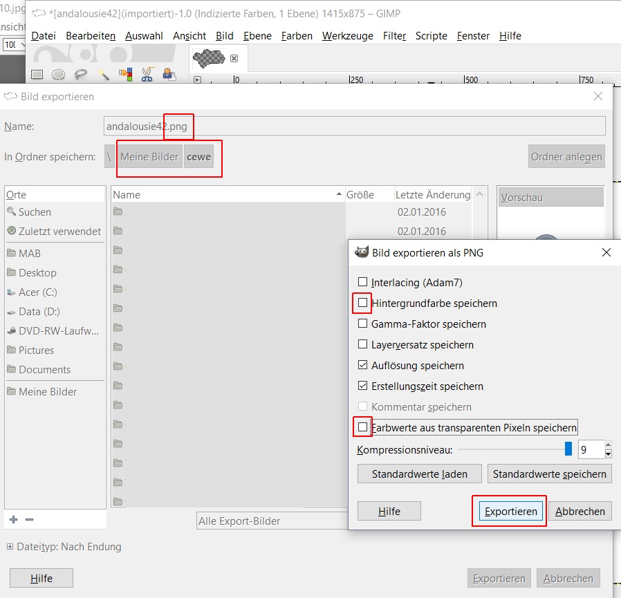 wo hast Du in dem Beispiel die Vorlage "andalousie-42" gespeichert, die Du dann mit GIMP bearbeitest hast?? Ich kann die Vorlage so nicht öffnen. Wenn ich in GIMP über Öffnen mir die Vorlage hereinhole, ist die Rubrik "Alphakanal hinzufügen" grau unterlegt. Dadurch bekomme ich auch nicht die kleine Maske rechts unten angezeigt. Was mache ich falsch? Die weiteren Ausführungen sind gut dargestellt und werde da wohl dann keine Schwierigkeiten mehr haben. Tut mir leid, Dir soviel zuzumuten.