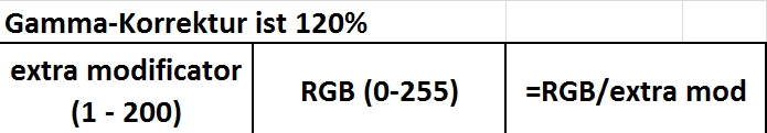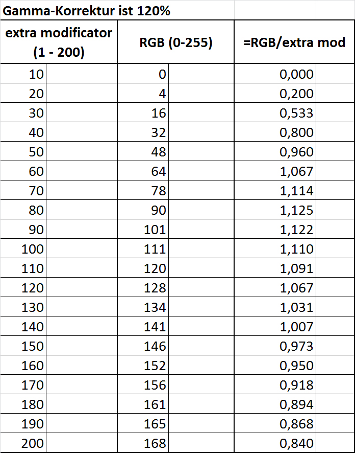 Die Werte der mittleren Spalte sind dem Farbwahl-Dialog entnommen und sind RGB-Werte. Die Werte der linken Spalte sind dem Gamma-Korrektur-Dialog entnommen und sind %Werte in einem Wertebereich von 1 bis 200.☼PeFoto☼ hat geschrieben: Abschließend noch eine kurze Frage zu folgender Rechnung.