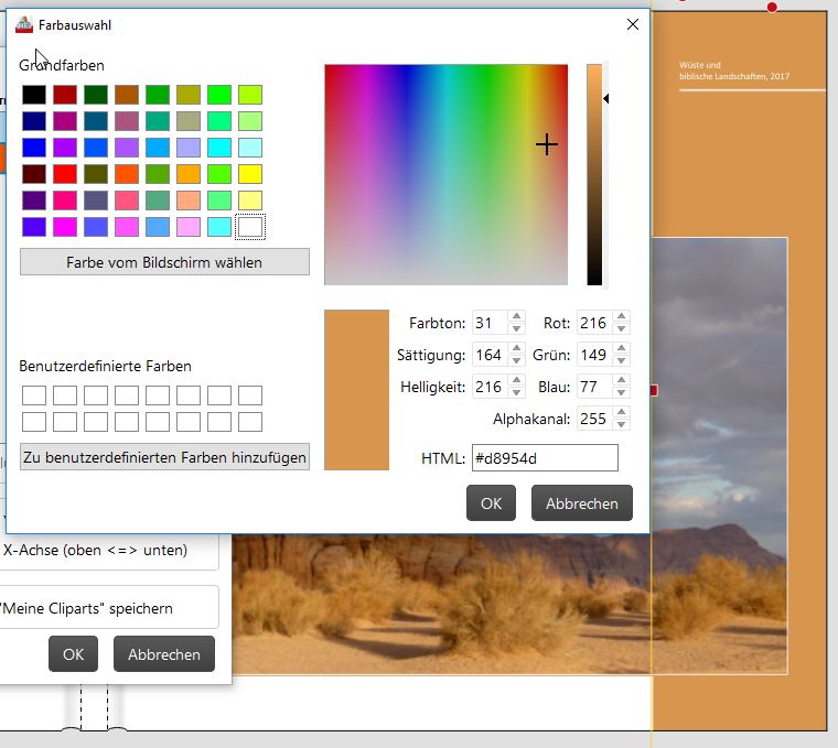 Dann nutze diese Möglichkeit.Ich zeige Dir, wie ich vorgehen würde am Beispiel meines aktuellen Fotobuchprojekts. Das Buch ist inzwischen gedruckt. Ich habe auf allen Doppelseiten einen farbigen clipart-Streifen auf der rechten Seite. Der Titel mit "goldigem" Farbton sieht so aus: Die Farbwerte des Streifens kann ich bei cewe auslesen: Mit einem externen Bildbearbeitungsprogramm ein einfarbiges Bild anlegen. Ich habe PSE. Größe: 40x40 cm, Auflösung 300dpi. Farbwerte eingeben, z.B. den HTML-Wert (der andere stellt sich selbst ein). Als jpg in größter Qualität abspeichern. Wenn ich dieses Foto als Hintergrund einfüge und das clipart auf der rechten Seite stehen lasse, sieht die Doppelseite so aus: Aber Vorsicht: Ich habe die Erfahrung gemacht, dass Fotos und cliparts in derselben Farbe nicht unbedingt gleich von cewe gedruckt werden. Diese beiden sollten also nie direkt aufeinander treffen. Was sicherlich machbar ist und bestimmt gut aussieht, ist, das Foto als unterste Ebene zu legen und mit einem Verlauf zu belegen, also nicht als Hintergrundbild. Ich habe das probiert und finde das schön: Wäre das eine Lösung für Dich? Lieber Gruß, pitty