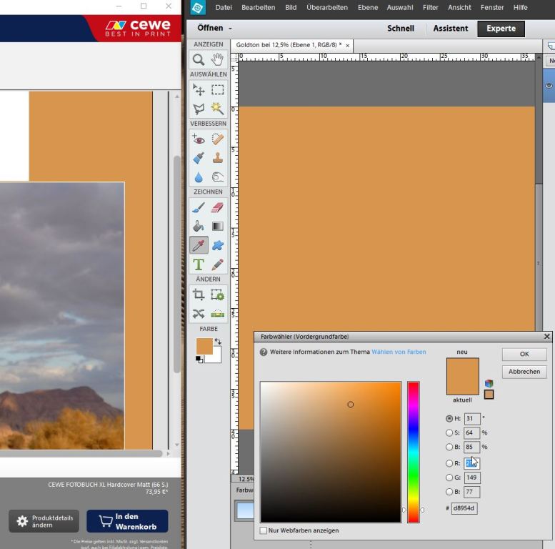 oh, da habe ich mich wieder mal ungenau ausgedrückt. Wenn ich die Farbe mit der Pipette bestimmt habe, und die einzelnen Werte eingegeben habe klicke ich auf "speichern " und lege das neue einfarbige Bild bei meinen eigenen Bildern/Fotos auf dem Laptop in einem extra angelegten Ordner "selbst erstellte Hintergründe ab. Somit kann ich diese wie Fotos verwenden und eben auch mit Verläufen belegen. Ich wollte ein warmes" goldgelb" aufnehmen um mit dem Hintergrund eine Verbindung zu den einzelnen Fotos herzustellen. Abgespeichert schaut es noch ganz brauchbar aus, wenn ich es dann verwende wirkt es eher ins sandfarbene mit gelbstich Im Cewe-Programm komme ich mit der Pipette irgendwie viel besser zurecht. VG geniesser66