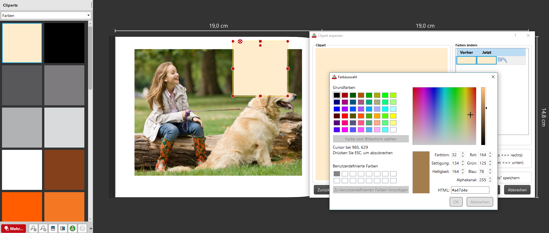 vielleicht verstehe ich das Thema noch nicht ganz, aber aus meiner jetzigen Sicht ist es mit der Software möglich. Sie nehmen ein farbiges Clipart, färben dieses in der Software um und ziehen es auf die gewünschte Größe. Ob Sie das farbige Clipart nur als Dekoelement nutzen oder als Hintergrund, bleibt Ihnen überlassen. Wichtig ist nur, dass es über die Buchseite gezogen wird. Andernfalls kann es zu Blitzern kommen. Sylke Re: Anleitung einfarbiges Bild erstellen bei/mit PaintMan kann aber auf die Cliparts leider noch keine Masken anwenden. Wenn das möglich wäre, bräuchte man endlich keine einfarbigen Bilder mehr.