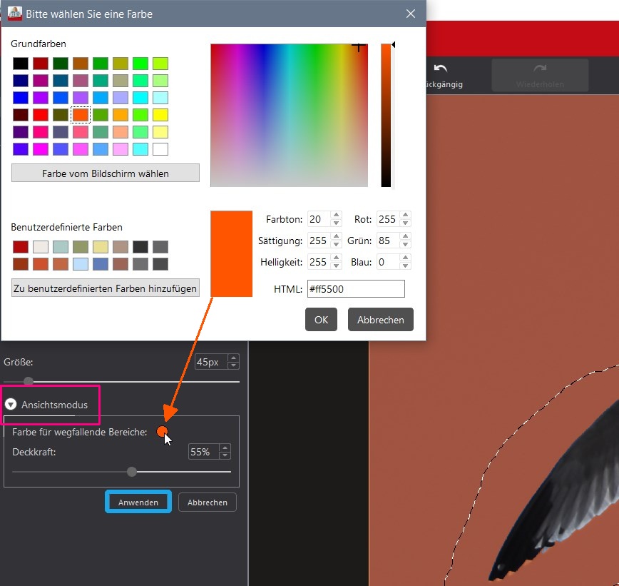 Die Maskierungsfarbe kann man ändern unter "Ansichtsmodus". Ich hatte Orange. Und man kann die Deckkraft verändern, damit man das drunter liegende Bild noch sehen kann (in meinem Screenshot ist leider nur einfarbiger Himmel, da sieht man nix) .
