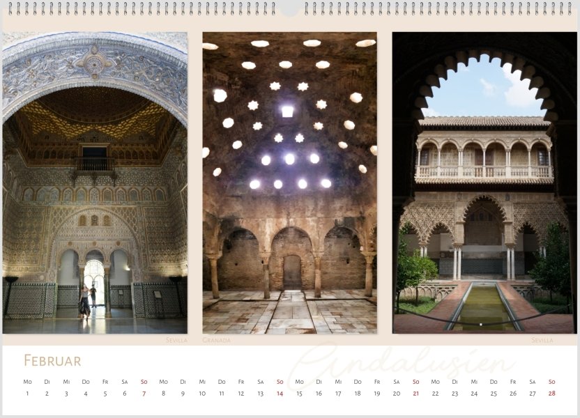 Auch ich gestalte für meine Mama jedes Jahr einen - was das Layout betrifft - relativ simplen Kalender mit im vorhergehenden Jahr selbst geschossenen Bildern. Dabei sollen die, tendenziell wenigen Bilder, für sich sprechen. (Format jeweils Wandkalender A2 Panorama) (Die hier gezeigten Bilder sind alle von meinem Andalusienurlaub der etwas anderen Art... Andalusien während Corona... Sehr speziell. Beinahe keine Touristen und eine ganz spezielle Stimmung.)