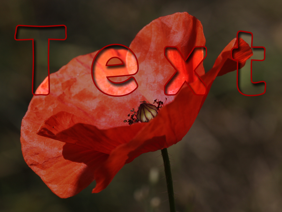 1. - Blumenbild geladen - Ebene dupliziert (=Hintergrund Kopie = 2. Ebene) 2. - 3. Ebene = Text in schwarz und eine Kontur von 10 PX in weiß 3. - die 2. Ebene (Hintergrundkopie) mit 30% weiß gefüllt 4. - mit dem Zauberstab das Schwarz der Buchstaben markiert, dass eine Auswahl entsteht. 5. - die Textebene mit der darunterliegenden Ebene verbunden. 6. - die markierten schwarzen Textteile mit der "Entf"-Taste gelöscht. 7. - alles auf Hintergundebene reduziert und als jpg gespeichert. So lange die Ebenen nicht verbunden sind, kann mit Text, Farbüberlagerung, Textrand ect. gespielt werden, bis das Ergebnis passt. Das ist vielleicht eine relativ einfache Möglichkeit der Umsetzung. Liebe Grüße
