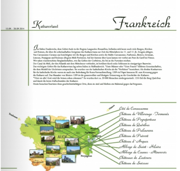 Schade um die gute Idee, die Lage der Burgen auf der Karte zu zeigen. Der "Mikadohaufen" ist hier nicht zielführend. Schade, dass die Fotos die Karte verdecken. @okular hat schon ein Gestaltungsbeispiel von vielen zu Karten genannt: So könnten die Fotos separat auf der Buchseite platziert sein und eine Bildunterschrift mit entsprechender Nummer und Namen der Burg erhalten. Vielleicht erstellt jemand einen Beitrag zum Thema Kartenverwendung? Ich habe z.B. die besonderen Orte eines Tagesausflugs auf Teneriffa auf der (aus dem Netz geladenen) Landkarte in cewe eingefügt und hier mit "Pins" markiert sowie die Ortsnamen am Rand größer und mit einer gut lesbaren Schrift wiederholt. Lieber Gruß, pitty