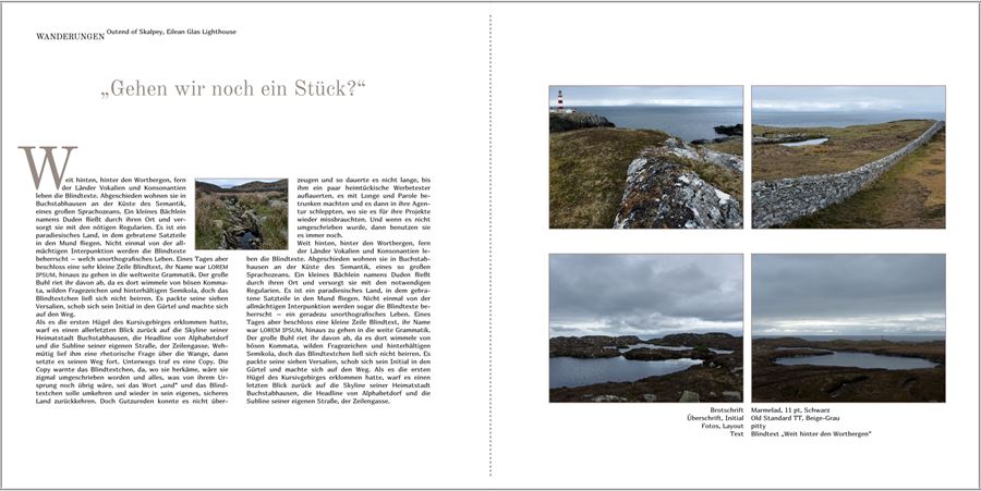 Das Beispiel zeigt Fotos von unserer Schottlandreise. Die bereiste Landschaft ist überwiegend rau, zerklüftet und schroff. Die Schriftart für den Grundtest soll also diese Eigenschaften widerspiegeln. Ich habe daher eine serifenlose Schriftart mit starken Kontrasten ausgesucht: Die Striche der Buchstaben sind nicht gleich dick und der Charakter ist eher schroff (jedenfalls nicht lieblich). Im Gegensatz zum Brottext soll die Überschrift aus einer Schrift mit Serifen gesetzt werden, da ich dort persönliche Gedanken wiedergebe. Für einen harmonischen Klang wähle ich eine ebenfalls kontrastreiche Schrift aus. Überschrift, Initial: Old Standard TT, Beige-Grau Fotos: pitty Blindtext: „Weit hinter den Wortbergen“ (Dank @dsl-schnell) Lieber Gruß, pitty