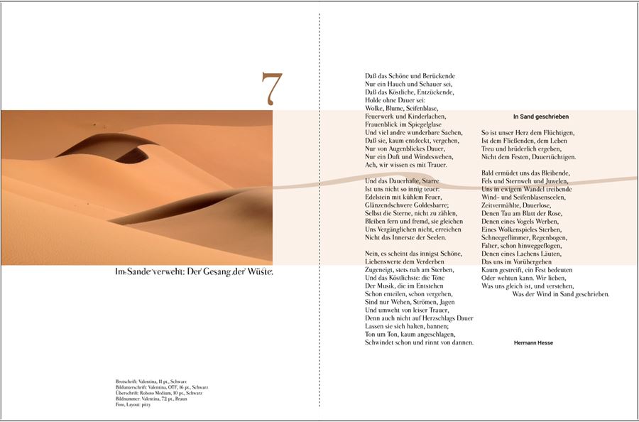 Ob Fotos oder Text im Mittelpunkt stehen, kann man wahlweise bestimmen. So könnte ein Foto mit einem lyrischen oder rein informativen Text ergänzt werden. Oder eine Beschreibung wird mit illustrierenden Fotos unterstützt. Im Beispiel habe ich mich für die romantische Fassung entschieden. Eines meiner Wüstenfotos wird mit einem Gedicht vollendet. Als Brotschrift wähle ich eine moderne Serifenschrift, die mit einem serifenlosen Font (nur reduziert) ausgezeichnet wird. Bildunterschrift: Valentina, OTF*, 16 pt., Schwarz Überschrift: Roboto Medium, 10 pt., Schwarz Bildnummer: Valentina, 72 pt., Braun Foto, Layout: pitty *Die Schriftart Valentina bietet eine Besonderheit: Die Open-Type-Funktion bietet Schmuckbuchstaben und Schmuckligaturen. Den Funktionsumfang kann man nicht direkt in cewe nutzen. Wer otf-unterstützende Programme besitzt (z.B. Photoshop, InDesign, Word neueste(?) Version) und die otf-Font-Datei installiert hat, kann jedoch über Umwege entsprechend gestaltete Texte als Foto einbinden. Diese Spielerei wollte ich Euch nicht vorenthalten: