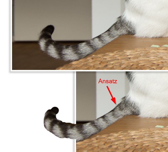 Hallo AU216,Ich hoffe, ihr habt mein Problem verstanden. Mache ich hier irgendwas falsch? ich habe auch zwei Bilder verwendet, weil das Hauptbild einen Farbrand hat, über den der Schwanz hinausragt. Es gibt ein paar Tricks, solche "Stapel" auszurichten. Wenn man nur einen kleinen Teil wie hier freistellt ist das Ganze etwas unkomfortabel, weil die Freistellung als Ausschnitt und nicht in Originalgröße ausgegeben wird. Ich helfe mir so: Zusätzlich zur Freistellung füge ich das komplette Bild zweimal ein und lege diese beiden übereinander. Das untere bleibt in Originalgröße und ist mein Hilfsbild zum Ausrichten der Freistellung. Das obere verkleinere ich mit dem Seitenanfasser(! wichtig) so weit, wie ich es möchte. Dabei verschiebt sich der Bildinhalt. Wenn man das Originalformat benutzt, schiebt man den Bildinhalt einfach wieder zur richtigen Seite. Wenn man Anpassungen vorgenommen hat, macht man das obere Bild vorübergehend 50% transparent und schiebt den Bildinhalt passend. Der Zoomfaktor hat sich nicht verändert, so dass das recht einfach geht. Nun kommt die Freistellung ins Spiel. Man macht sie zu 50% transparent, legt sie auf die entsprechende Stelle und fängt an anzupassen. Wenn man nun das Bildfeld mit den Eckanfassern verkleinert oder vergrößert, verändert sich die Größe des Bildinhaltes und man kann damit die passende Größe suchen. Damit kann man feiner skalieren als mit dem Zoomfaktor. Ich wende aber noch einen kleinen Trick mit dem Zoom an: Ich verkleinere das Foto beim ersten Mal ein bisschen mehr als gebraucht und zoome es eine Stufe hoch. Dadurch habe ich dann die Möglichkeit, ganz feine Anpassungen zu machen, indem ich den Bildinhalt anstatt das ganze Bild schiebe. Für das Ausrichten braucht man Geduld, Texturen wie Katzenfell (oder Wasser oder Sand) brauchen einfach mehr Zeit zum Ausrichten als gerade Kanten. Es sieht aber auch total niedlich aus, die Ohren über den Rand schauen zu lassen. Für Katzenliebhaber lohnt sich das definitiv Ein paar Screenshots zum besseren Verstehen (die Freistellung habe ich für diese Anleitung nur grob gemacht, sonst hätte meine Zeit nicht gereicht liebe Grüße