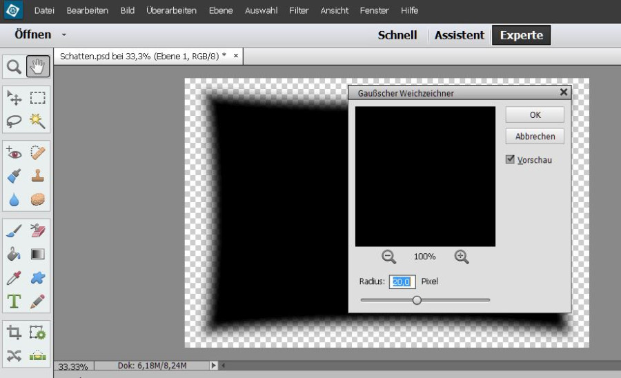 am einfachsten funktioniert es mit der Photoshop-Aktion von der Panos-Seite, die in diesem Thread schon verlinkt wurde. In Sekundenschnelle ist das Bild mit dem Effekt versehen, egal welches Format. Funktioniert aber erst ab Elements 11. Vielleicht ist es ja eine Option für dich, da nachzurüsten LG