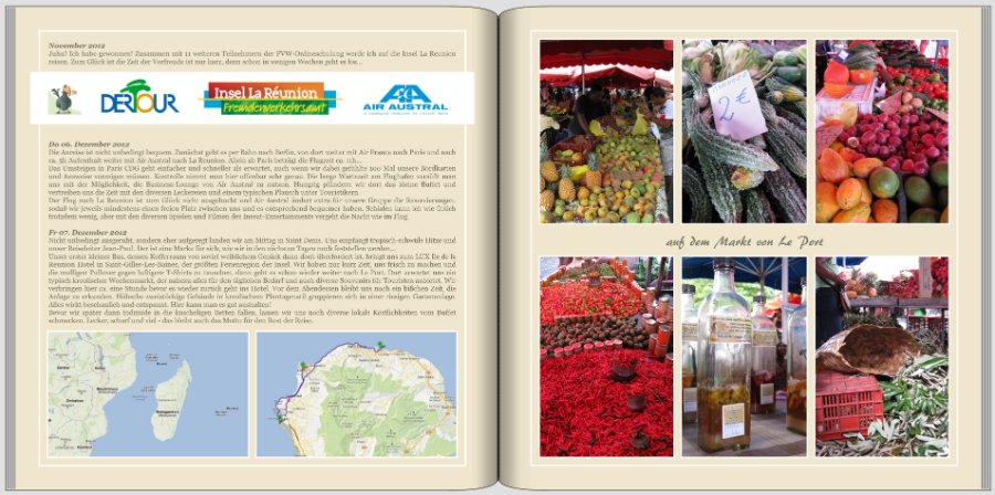 Die gezeigten Seiten sind als Kapiteleröffnung gedacht. Auf der ersten Seite ist eine kurze Tagebuchbeschreibung auf der zweiten Info zum Ziel usw. Liebe Grüße Asiafan