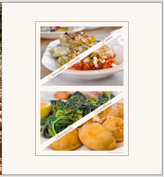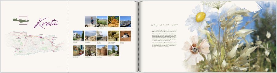 Das ist ja eine tolle Idee, das gefällt mir richtig gut!PanoramaKreta1.jpg PanoramaKretaLinks.jpg PanoramaKretaRechts.jpg Die Essensfotos sind von reisereporter.de, die übrigen Fotos von mir. Der Gedanke ist, die Panoramaseite soweit vorn wie möglich zu platzieren, sodass die linke Seite mit der Karte beim weiteren Blättern ausgeklappt bleiben kann. So kann man gut verfolgen, wo man war. Bei (größeren) Rundreisen kann ich mir das besonders gut vorstellen. Darf ich fragen wie du das mit drn Blumen rechts gemacht hast? Das ist doch ein Foto, und die Blumen links sind ausgeschnitten und sehen aus wie gezeichnet?! Liebe Grüße,