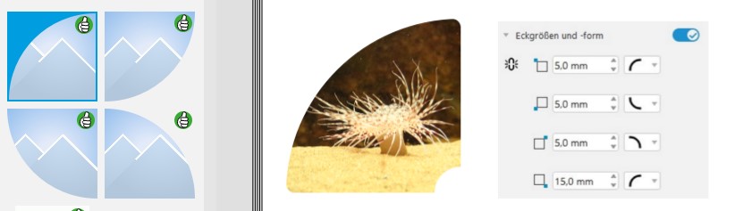 Du kannst die Eckenfunktion mit allen Masken kombinieren, es macht nur nicht mit allen einen optischen Sinn. Möchtest Du Sylkes Beispiel nachstellen oder etwas anderes? Sylke hat Viertelkreismasken verwendet und anschließend zusätzlich mit der Eckenfunktion weitere Rundungen gestaltet. Ein Beispiel dazu: Und noch ein weniger sinnvolles Beispiel zur Verdeutlichung, dass Ecken mit allen (formenden) Masken kombiniert werden können. Liebe Grüße