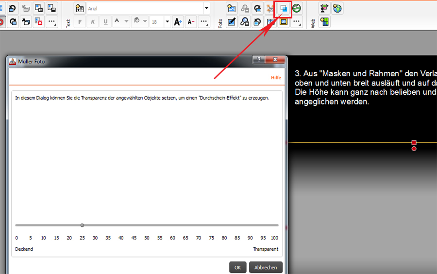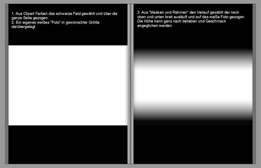 willkommen im Forum. Habe leider gerade keinen Rechner mit Fotobuchsoftware und kann deshalb keinen Screenshot posten. Evtl. hilft Dir meine Erklärung trotzdem weiter. Ich würde einen schwarzen Hintergrund für die Seite verwenden. Dann ein "Foto" einfügen. Das "Foto" ist eine komplett weiße Fläche (ggf. aus externen Programm gestalten oder Du suchst Dir eine weiße Fläche (JPG-Datei) im Internet ). Über dieses Weiß-Foto wird dann eine Verlaufsmaske gelegt. (Verlauf oben und unten auslaufend). Das Weiß-Foto dann über die ganze Buch-Breite ziehen bzw. am Besten etwas über den Rand lappen lassen. Gruß DSL-schnell Gruß DSL-schnell