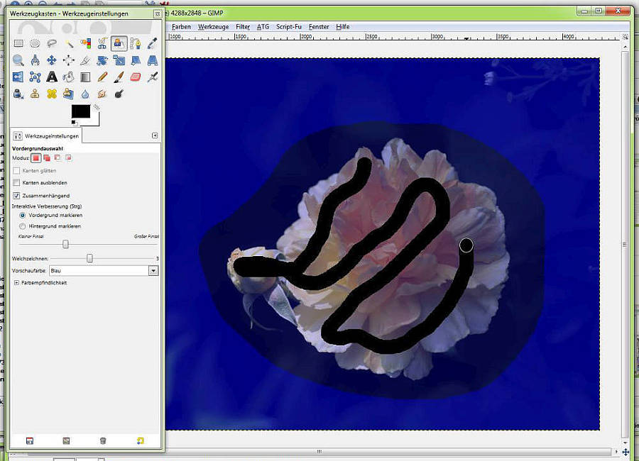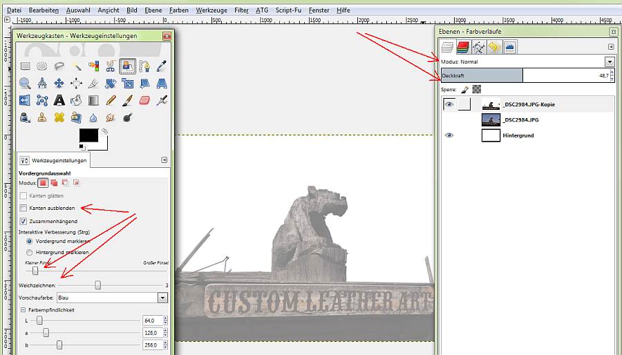 es gibt viele verschiedene Wege, Objekte freizustellen. Vielleicht ist der oben erklärte nicht so gut für Dein aktuelles Projekt geeignet, weil die Kontraste und Farbunterschiede viel geringer sind? Du könntest Dich. über die Anwendung von Masken in GIMP informieren, um mehr Möglichkeiten kennenzulernen, z.B. hier: http://gimp-werkstatt.de/ebenenmasken.php https://de.wikibooks.org/wiki/GIMP/_Tut ... reistellen Warum Du jetzt ein blasses statt eines freigestellten Objektes hast, kann ich nur vermuten. Kannst Du ein Bildschirmfoto machen? ['Druck'-Taste auf Deiner Tastatur drücken, GIMP öffnen, 'Datei - erstellen - aus Zwischenablage', mit Hilfe von 'Zuscheiden' aus dem Werkzeugkasten (Skalpell-Symbol) einen Bereich auswählen und 'Enter' drücken und ggf. die Größe anpassen = skalieren (Bilder im Forum dürfen höchstens 900px groß sein), abspeichern und hochladen.] Möglicherweise sind irgendwelche Empfindlichkeiten, Schwellenwerte oder Toleranzen nicht optimal eingestellt. Die Regler dafür findest Du in der unteren Hälfte es Werkzeugkastens. Das ist Feinturing, das in jedem Programm anfällt. Möglich ist aber auch, dass Du die falsche Ebene bearbeitet hast, oder den falschen Ausschnitt (z.B. Invertieren vergessen), oder dass die Deckkraft einer Ebene nicht 100% ist ('Ebenen - Farbverläufe' im Fenster rechts von der Arbeitsfläche). Hast Du die Sichtbarkeit aller nicht benötigten Ebenen ausgeschaltet? GIMP ist sehr mächtig, es ist sehr einfach sich im Dschungel der Möglichkeiten zu verlaufen Liebe Grüße, nox
