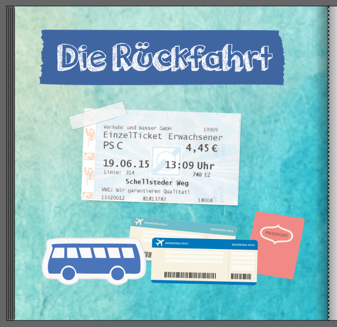 rechte Seite aus einem Fotobuch. Meist lege ich Eintrittskarten fächerförmig aus und klemme sie hinter ein Foto.