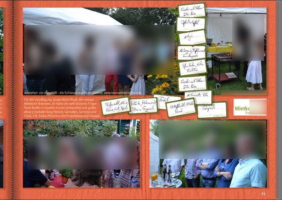 rechte Seite aus einem Fotobuch, die grün gerahmten Zettel sind die Beschriftungen vom Buffet, der Hintergrund ist eine eingescannte Serviette vom Stapel neben dem Buffet. Für die Seiten dieser Feier hatte ich außerdem die Einladungskarten verwendet und auf jeder Doppelseite links oben eingeblendet.