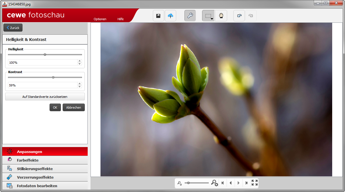 Manchmal blendet die Sonne, sodass sich die Lichtsituation nicht immer direkt einschätzen lässt. Erst am Rechner daheim merkt man dann manchmal, dass der Kontrast zu hoch oder das Bild zu hell ist. In unserer Fotoschau können Sie auch diese Probleme (sollten Sie nicht zu stark sein) mit der Funktion Helligkeit und Kontrast ausgleichen.