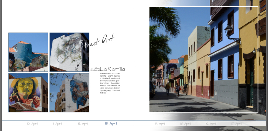 Die Leiste zieht sich durch das ganze Buch, d.h. man kopiert sie von Seite zu Seite, wobei praktischerweise zunächst alle Informationen gleich formatiert sind. Ich mag ein helles Grau dafür gern. Auf jeder Doppelseite hebt man dann die entsprechende Info - das Datum, das Ausflugsziel ... – farblich ab, z.B. in schwarz oder in einer zur Seite passenden Farbe, zusätzlich vielleicht auch in Fettdruck oder einer höheren Schriftgröße. Das ist sozusagen eine Imitation der Anzeige am PC, bei der aktive Bereiche farblich markiert sind bzw. inaktive ausgegraut und die wir sofort entsprechend einordnen.