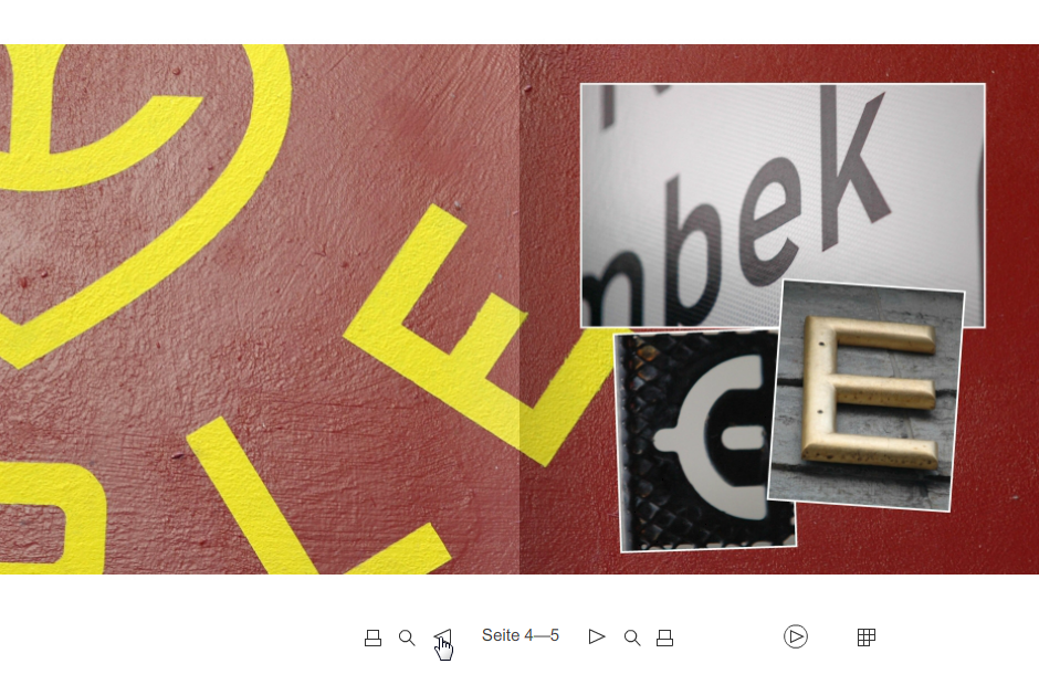 Eines dieser künstlerischen Projekte ist vielleicht das Beispiel „eBook“ von Ulf Kotting. In seinem Projekt setzt er sich fotografisch mit dem Buchstaben „E“ auseinander und wählt dafür eine simple aber künstlerische Gestaltung, in der die Fotos im Vordergrund stehen.