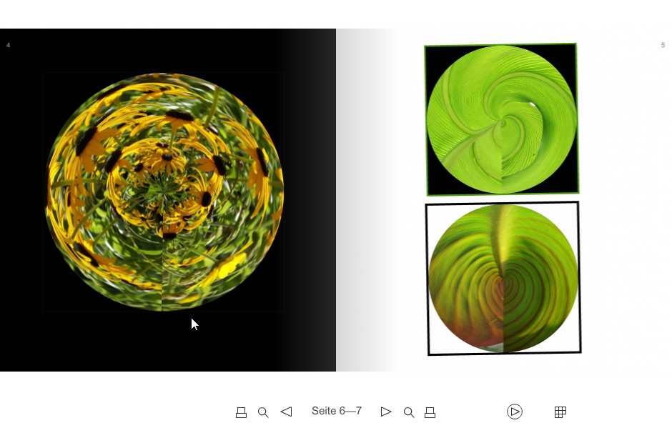 Ein Beispiel, dass ich jedoch finden konnte, ist „Die Zauberkugel“ von Inge Stieb. Diese Gestaltung mag Ihnen vielleicht nicht auf den ersten Blick zusagen. Jedoch versteckt sich hinter der Gestaltung ein künstlerischer Gedanke, den Sie auf der vierten Seite umschreibt.