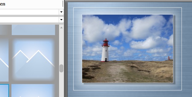 ich bin mir grad nicht sicher, was Du mit "rechts im Bild" meinst. Ich würde es so machen. Hinter das Foto, noch ein Foto einfügen (weißes Bild). Etwas größer ziehen, damit es das Foto überlappt. Dann Transparenz setzen. ggf. das weiße Foto sogar noch mit Masken belegen. Gruß DSL-schnell Gruß DSL-schnell