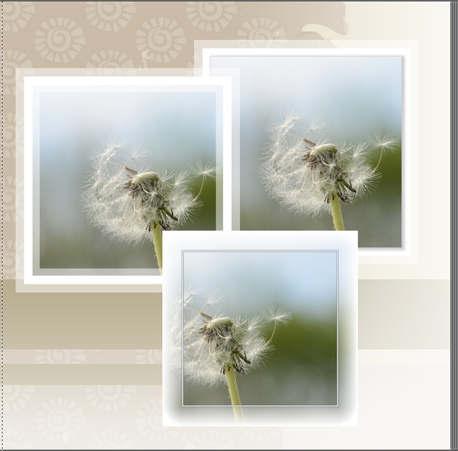 DSL-schnell hat schon schöne Beispiele gepostet. Ich denke auch, dass diese Rahmenelemente mit einer externen Software erstellt sind, wenn nicht sogar die ganze Seite. Ich habe mal versucht, den Effekt nachzuahmen mit einer "Schichtung". Zuunterst habe ich ein weißes Bild gelegt, darauf ein schwarzes mit einem 4-Seiten-Verlauf und dann das eigentliche Foto, etwas verkleinert. Das weiße und schwarze Bild habe ich noch leicht transparent gemacht. Mit den Transparenzen und mit den Größen kann man auch noch variieren. liebe Grüße