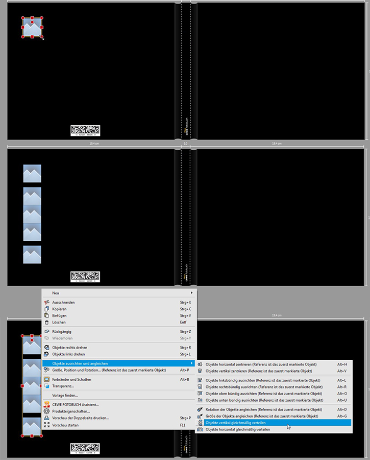 Um eine gleichmäßige Verteilung der Platzhalter zu erzielen, markieren Sie die fünf Bildfelder und machen einen Rechtsklick auf Ihrer Maus. Unter „Objekte ausrichten und angleichen“ wählen Sie „Objekte vertikal gleichmäßig verteilen“ aus.