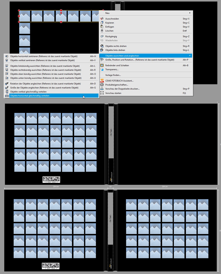 Nun fügen Sie weitere sechs Platzhalter ein. Diese ordnen Sie neben dem ersten Bildfeld waagerecht an. Dann markieren Sie die erste Reihe und wählen nach einem Rechtsklick unter „Objekte ausrichten und angleichen“ „Objekte horizontal gleichmäßig verteilen“ aus. Nun kopieren Sie die Platzhalter und fügen Sie so oft ein bis Sie auf insgesamt 35 Bildfelder kommen.