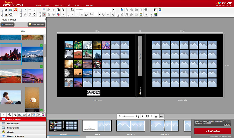 Auf der Rückseite platzieren Sie nun 35 unterschiedliche Aufnahmen. Dafür ziehen Sie die Fotos einfach in die Bildfelder hinein.