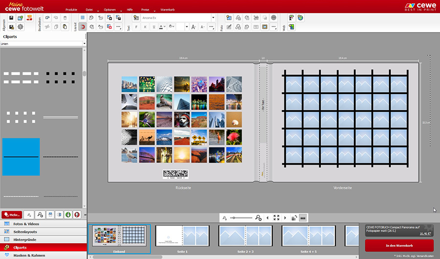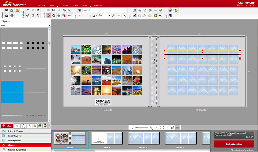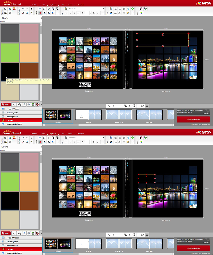 Die Gestaltung der Vorderseite bekommt man mit den Bordmitteln der Fotoschau noch viel schneller und einfacher hin. Ich habe mal eine Vorderseite mit der Funktion "Collagen" erstellt. Man s tellt 7 Spalten und 5 Zeilen ein., die Randstärke beträgt in meinem Beispiel 4%. Die Drehung steht auf 0. Die Rahmenfarbe kann man frei wählen. Hat keine 2 Minuten gedauert! Noch ein Vorteil. Man kann das Ganze noch mit 1x anfassen verschieben bzw. ausrichten.