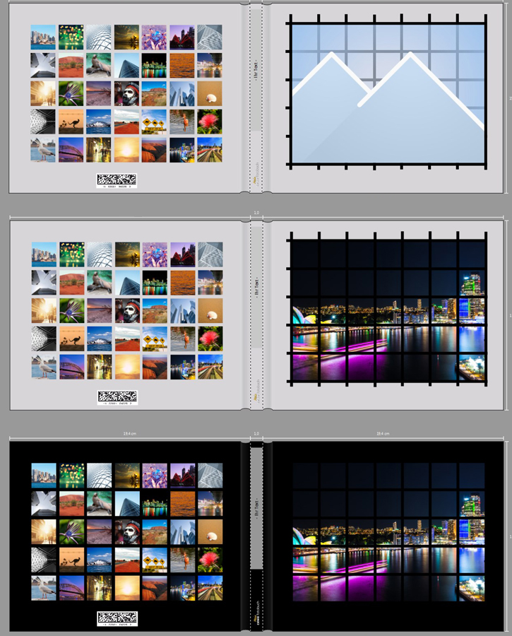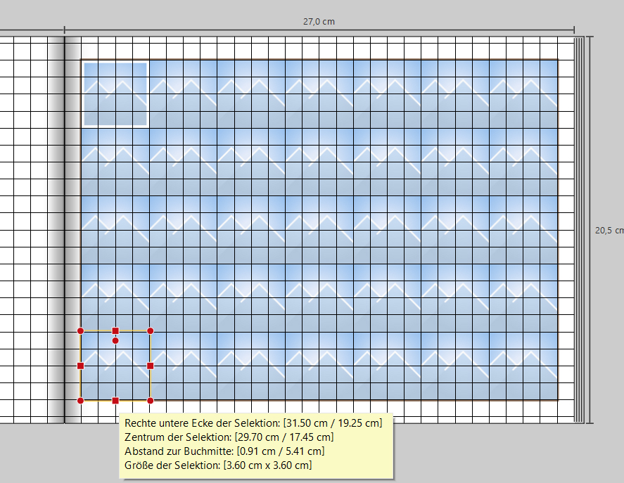 Im ersten Schritt wird dazu Foto auf der Vorderseite des Covers eingefügt und die Transparenz auf 100% gesetzt, damit das Raster sichtbar wird. Die kleinen Platzhalter habe ich zunächst nahtlos aneinandergefügt.
