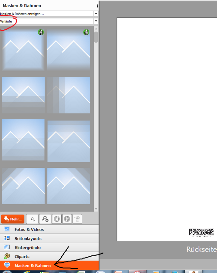 die Verläufe findest du unter Masken und Rahmen ( schwarzer Pfeil), dann ober (roter Kreis) die Verläufe, solltest du sie nicht finden dan mehr herunterladen. Ich hoffe es ist einigermasen verständlich, bin kein guter Erklärer. Re: Frage zum Hintergrund bei Fotobuch "Gardasee 2013"Oha,
