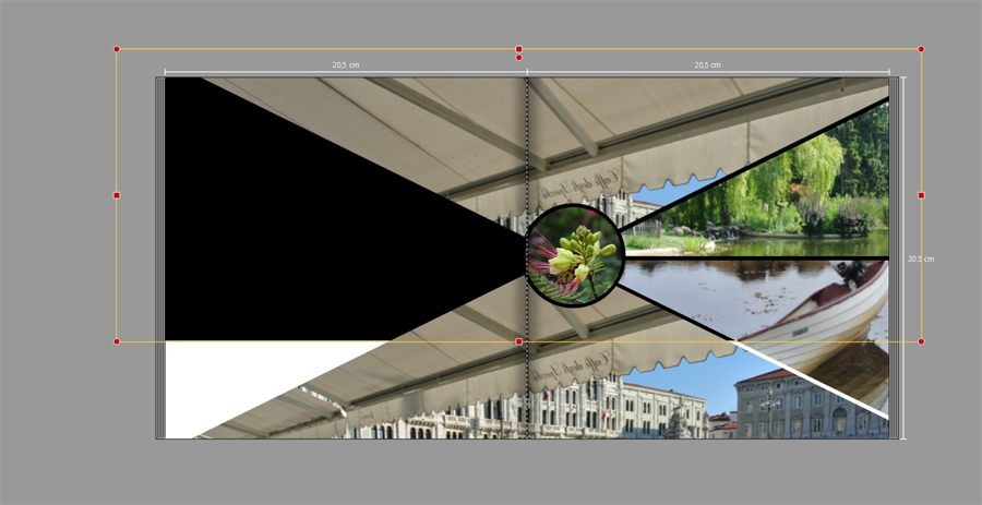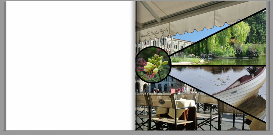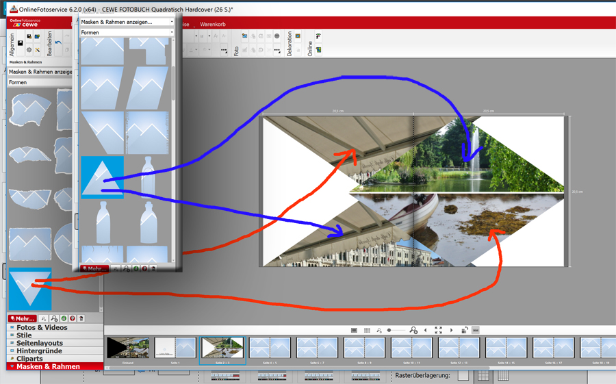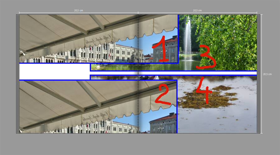 erstmal willkommen im Forum. Für die länglichen Fotos gibt es keine direkt passende Maske. Die Seite bzw. der Zuschnitt der Fotos wurde vermutlich extern erstellt. Wenn du dich also in einer Bildbearbeitungssoftware auskennst, ist es am einfachsten, du erstellst die passenden Zuschnitte oder sogar die ganze Seite dort. Falls nicht, kannst du den Effekt auch in der Software nachbauen. Dazu brauchst du etwas Geduld, Augenmaß und die passenden Fotos. Passende Fotos deshalb, weil das obere und untere Foto weit über den Rand gezogen werden müssen, auf dem Cover noch mehr als im Innenteil. Du brauchst dann zwei recht weitwinklig aufgenommen Fotos, damit du dein Motiv einigermaßen in den Ausschnitt einpassen kannst. Die Vorgehensweise wäre folgendermaßen: