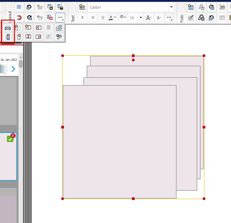 Re: Wie geht dieses Seite?Lis Viggers hat geschrieben: The picture on page 39: Is it 4 pictures with transparency and then the picture? And how to "move" them exactly the same distance? Here is how you can set them the same distance. You have to select all pictures and click both (red marked) icons : liebe Grüße