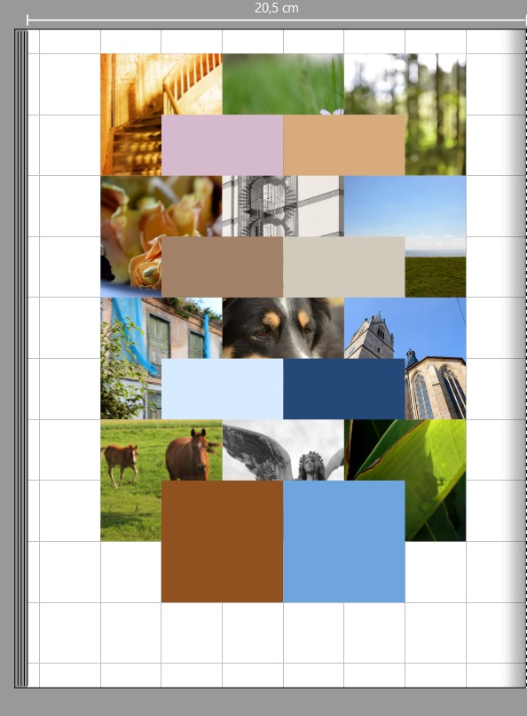 danke für die Tipps und schnellen Antworten. Mit dem Raster (5; 3,5 und 2,5 cm) hab ich experimentiert, aber die Software scheint das Raster nicht vom Seitenrand (z.B. oben Links oder rechts) anzulegen. Das hat dann nicht so richtig gepasst. Also hab ich den Tipp mit Raster und Linienclippard kombiniert. Die Linien zur Ausrichtung am Raster 0,5 cm benutzt. Danach dann die Fotos ausgerichtet. Zuletzt die Hilfslinien wieder entfernt Bin so zufrieden, s.u. Schönes Wochenende Euch allen, danke und liebe Grüße Blicki