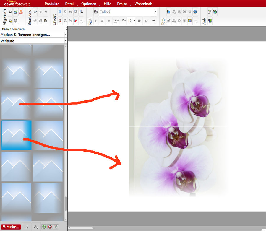 Hallo wogue, a) 1 Seite b) Seiten c) 4 Seiten. Ich würde es nicht schlecht finden, wenn es die Möglichkeit auch für 3 Seiten geben würde. Seit Ihr da meiner Meinung? ja, in der Tat, es gibt keine Maske, wo genau 3 Seiten verlaufen. Zur Not kann man sich behelfen, in dem man 2 Kopien des Bildes nebeneinander stellt und in einem Bild die eine Hälfte und im anderen die andere Hälfte zeigt und dann jeweils einen 2-seitigen Verlauf anbringt. Ich füge ein Beispiel an; das veranschaulicht das wahrscheinlich besser als komplizierte Erklärungen. Den dünnen weißen Strich zwischen dem oberen und unteren Bild habe ich absichtlich stehen gelassen, damit man erkennen kann, dass es sich um zwei Bilder handelt.