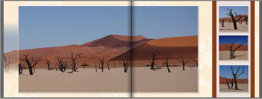 ich habe ein wenig gebstelt und bin - Dank Deiner vorzüglichen Anleitung - für einen ersten Entwurf recht weit gekommen; zumindest finde ich das. Aber Achtung! Die kleinen Fotos rechts sind noch nicht ausgerichtet und Abstände nicht kontrolliert. Dies stellt wieder NUR ein Experiment dar und soll keine 'echte' Seite des Namibia-Fotobuchs werden, zumindest nicht in der Form. Mir ging es ledigich darum, das Handwerkszeug kennenzulernen und meine eigenen Fähig- und Fertigkeiten etwas zu strapazieren. Aber sei es drum, hier der Entwurf: Viele Grüße Gerhard Re: Wie wird diese Seite gestaltetDieser Entwurf könnte doch glatt von Josefia sein