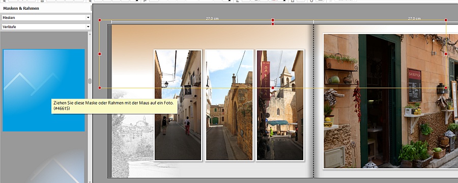 Da das nicht zu dem dortigen Thema passt, mache ich einen neuen Beitrag auf, gerne auch als Sammelbeitrag für solche Fragen. Zunächst geht es um diese Seite: Sie hat vergleichsweise wenige Elemente: 1. Das große Foto mit dem Verlaufsfoto links. Und 2. auf der rechten Seite drei Fotos auf einem doppelten Farbband. Sie sind recht einfach zu erstellen.