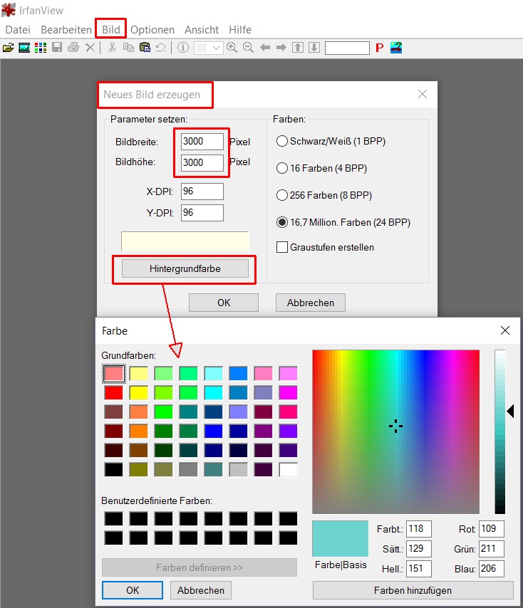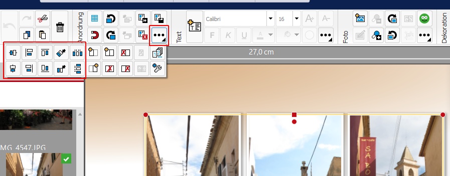Das Bild in der linken unteren Ecke ist mit dem Effekt „Starke Konturen“ (Menüpunkt „Stilisierungseffekte“) bearbeitet. Je nach Motiv ist der Effekt „Starke Konturen“ oder „Schwache Konturen“ geeigneter. Manchmal ist es auch nötig, den Kontrast etwas anzuheben („Helligkeit und Kontrast“ aufrufen und den Regler „Kontrast“ leicht nach rechts schieben). Man kann aber auch die neue Funktion "Optimieren" probieren. Zum Schluss bekommt das Bild im Fotobuch einen Eckverlauf nach rechts oben. In der linken oberen Ecke ist ein einfarbiges Bild eingefügt, das nicht sehr hoch ist, dafür weit über die Mitte gezogen ist. Es hat einen Eckverlauf nach rechts unten (#46615). (Habe ich schon gesagt, dass ich die Eckverläufe liebe?) Auch für das Bildbetrachtungsprogramm IrfanView gibt es schon Anleitungen im Forum, ich füge aber hier nochmal zwei Screenshots ein: Im ersten Screenshot wird das Bild über „Neues (leeres) Bild erstellen“ generiert. Man arbeitet die Parameter von oben nach unten durch und klickt zweimal OK. Das Bild kann im Anschluss in einem Ordner gespeichert werden oder man kopiert es einfach mit Strg+C und fügt es im Fotobuch mit Strg+V ein. TIPP: Die Bildbreite und –höhe sollten 3000 Pixel sein, damit die Größe im Fotobuch ausreicht und keine roten Warndreiecke angezeigt werden. Die kann man zwar technisch vernachlässigen, weil ein einfarbiges Bild nicht unscharf werden kann, sie stören aber gewaltig bei der Gestaltung (woher ich das wohl weiß? Im zweiten Screenshot ist beschrieben, wie man ein farblich angepasstes, einfarbiges Bild erstellt. Hier kann man vorm Speichern oder Kopieren mit Strg+R den Größe-Ändern-Dialog aufrufen und das Bild ebenfalls auf 3000x3000 Pixel vergrößern. Als ich dieses Fotobuch gestaltet habe, gab es noch nicht die tolle Funktion, um Objekte gleichmäßig zu verteilen. Neben dem Hilfsraster und der Magnetfunktion ist diese Ausricht-Funktionen (wie die weiteren) sehr hilfreich und vereinfacht die Gestaltung enorm. Man findet sie hier: liebe Grüße