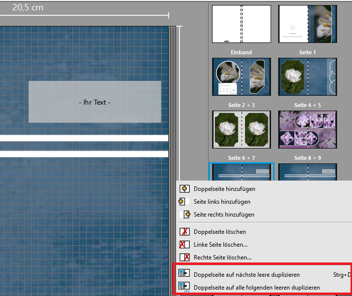 Wenn Du so etwas bei nächsten Mal vorhast, ist es ganz einfach, alle Elemente gleich auszurichten. Du gestaltest die gewünschten Elemente auf der ersten Doppelseite (oder, wenn es z.B. aus der Mitte des Buchs bis zum Ende gleich sein soll, auf der ersten freien Doppelseite) Dann klickst Du mit der rechten Maustaste auf die betreffende kleine Seitenvorschau. Es geht ein Menü auf, da kannst Du wählen, ob diese Doppelseite auf die nächste oder auf alle folgenden freien Doppelseiten übernommen werden soll. Für dieses Mal ist es so nicht mehr möglich, aber beim nächsten Buch hilft Dir das bestimmt weiter. Weiterhin viel Spaß beim Gestalten! Liebe Grüße