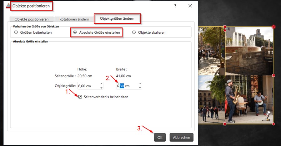 Hi Josefia,I think, it's not possible to change the size of this lines. But I want to show you a way to get equal spaces First bring your pictures close together with the magnetic helplines. Then use Alt+P to open the following dialog (don't know what it is in your language) to resize your pictures. If you want to have a space of 3 mm, decrease the size 0,3 cm as shown. Do it for both high and wide or first activate the option like shown. The pictures will be resized symmetrically and you will have an identical space. Ausrichten-magn.HL0.jpg . Then bring the lines in right position also with the magnetic helplines. Ausrichten-magn.HL1.jpg . I would not use shadow for the pictures. It is not realistic with a faded picture. To decide, which font-size is the best, write some text in word with your preferred font in different sizes and print it. Thank you very much for your answers. Kind regards