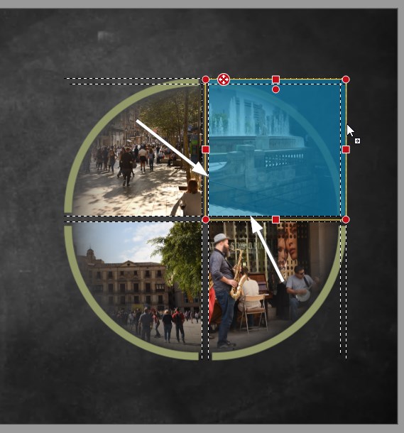 I think, it's not possible to change the size of this lines. But I want to show you a way to get equal spaces First bring your pictures close together with the magnetic helplines. Then use Alt+P to open the following dialog (don't know what it is in your language) to resize your pictures. If you want to have a space of 3 mm, decrease the size 0,3 cm as shown. Do it for both high and wide or first activate the option like shown. The pictures will be resized symmetrically and you will have an identical space. Then bring the lines in right position also with the magnetic helplines. I would not use shadow for the pictures. It is not realistic with a faded picture. To decide, which font-size is the best, write some text in word with your preferred font in different sizes and print it. liebe Grüße