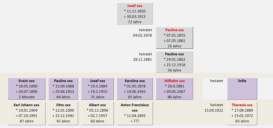 Re: Stammbaum erstellenDas Problem hatte ich auch, habs dann aber aufgegeben und die Familiengeschichte (1757 - etwa 1940) einfach chronologisch dokumentiert. Ich konnte mir die Daten aus einem "Ortssippenbuch" zusammenkopieren. Meine Großeltern stammten aus dem gleichen Ort und so konnte ich beide Familien-Seiten zurückverfolgen. Es war auch eine Fieselei, die einzelnen Textteile sauber zu kopieren und in PhotoShop untereinander zu platzieren, aber es ist alles vollständig und relativ übersichtlich.
