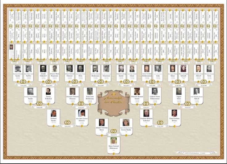 Ich habe nun ein wenig gebastelt, bin mir aber absolut nicht sicher. Vielleicht könnt ihr mal drüberschauen. Der größte und älteste meiner Familienzweige geht über 14 Generationen, das sind eine Menge Leute. Ich habe nun quer gearbeitet und die Linie meines Großvaters über 2 Seiten gearbeitet, d.h. die hellblau unterlegten Personen finden sich auf der nächsten Seite wieder. Die Linie meiner Großmutter hat nicht mehr draufgepasst und bekommt eine weitere Seite. Nachdem ich mich ja auskenne, erscheint es für mich logisch, aber wie sehen es Außenstehende? Die Familien bekommen jeweils einen andersfarbenen Hintergrund. Auf den leeren Flächen durch fehlende Vorfahren werde ich vielleicht noch ein paar ausgebleichte Dokumente einfügen, aber eher so als Hintergrund. Das Feintuning fehlt übrigens noch, das braucht dann noch viel Zeit, also genaues Ausrichten usw. Bin gespannt auf eure Meinung und Danke schon mal. Re: Stammbaum erstellenMonika54 hat geschrieben: Vielleicht könnt ihr mal drüberschauen.