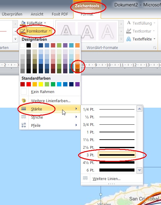 Re: Landkarte - Orte verbindenAh, Josefia, die Pfad-Funktion in Word kannte ich noch nicht - das muss ich ausprobieren. Meines Wissens gibt es die PFad-Funktion nur in PS aber nicht in PSE. In PSE habe ich mich bis jetzt damit gespielt, Kreissegmente mit unterschiedlichen Radien aneinanderzufügen.