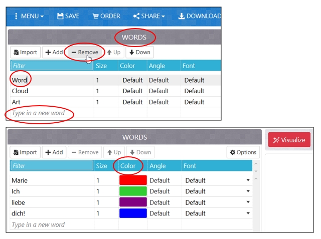 → Farbe (Color) pro Wort auswählen